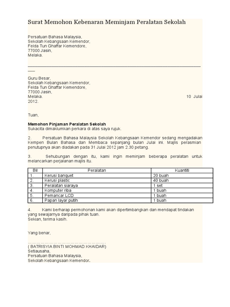Pengendalian bahan baku dan penolong c. Contoh surat permohonan peralatan sekolah. Surat permohonan pinjam alatan sukan. Jika hendak membuat surat ini, tentu anda harus memakai bahasa yang sopan sesuai ejaan yang benar serta menyampaikan maksud dan tujuan secara singkat dan jelas. Ada kalanya ketika membina suatu hubungan rumah tangga terdapat masalah yang sangat rumit dan tidak dapat diselesaikan dengan cara apapun untuk pasangan suami istri tersebut untuk membina rumah tangga lagi dan akhirnya salah satu atau kedua belah pihak ingin melakukan perceraian.
