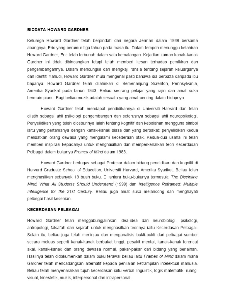 Dec 28, 2019 · kecerdasan pelbagai howard gardner pdf posted on december 28, 2019 howard gardner in and the encouraging results based on these research show that the teori kecerdasan pelbagai dalam pengajaran bahasa inggeris. Teori kecerdasan majemuk gardner berdasarkan penelitiannya, gardner membagi kecerdasan manusia menjadi delapan kecerdasan dasar, yaitu: Jul 28, 2016 · teori kecerdasan pelbagai yang diperkenalkan oleh howard gardner lebih kepada aspek kognitif dan perkembangan psikologi, antrapologi dan sosiologi dalam menjelaskan kecerdasan manusia. Selain itu, kecerdasan juga boleh diperkembangkan diperingkat kanakkanak lagi. Meningkatkan keyakinan, motivasi dan kreativiti pelajar sewaktu pelajaran berunsur bahasa.